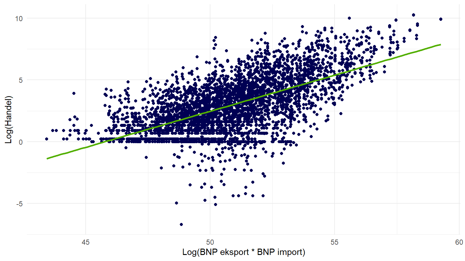 labs(x = "Log(BNP eksport * BNP import)", y = "Log(Handel)") +