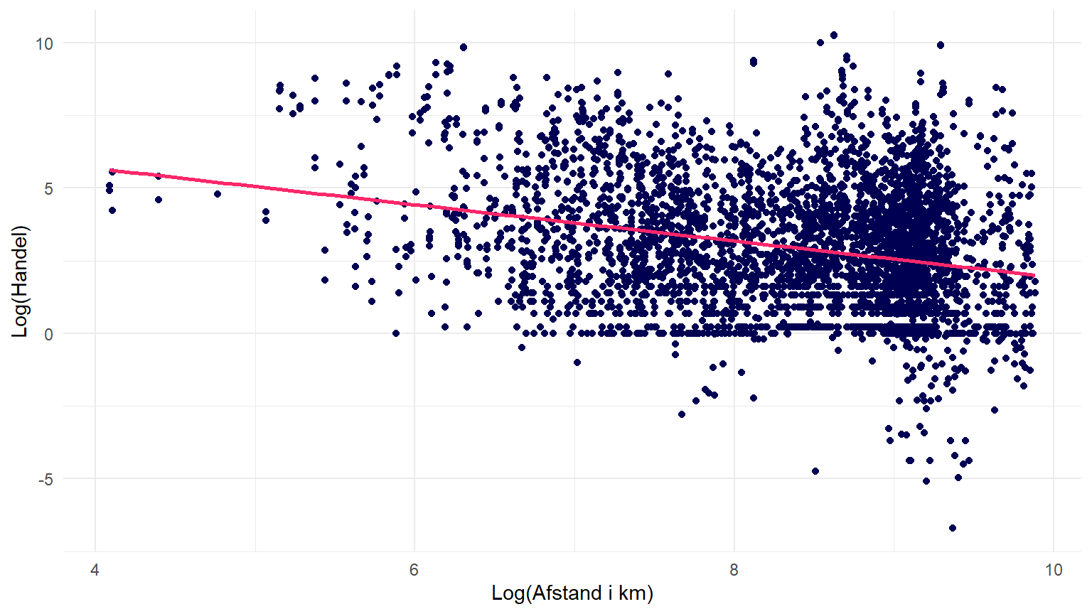 labs(x = "Log(Afstand i km)", y = "Log(Handel)") +